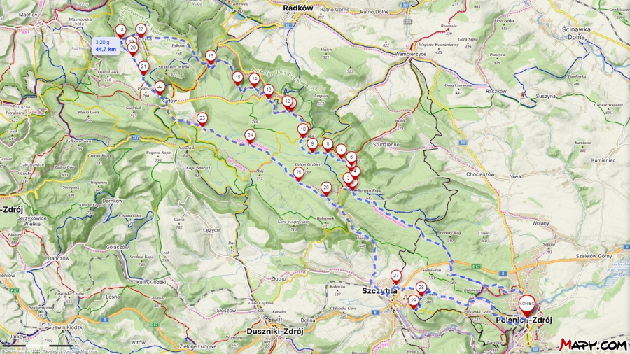 Pętla:Polanica Zdrój – Praski Trakt – Batorówek - Skalne Grzyby - Droga nad Urwiskiem - Pasterka - Łąki Pasterskie – Karłów – Kręgielny Trakt - Batorów – Szczytna – Polanica-Zdrój